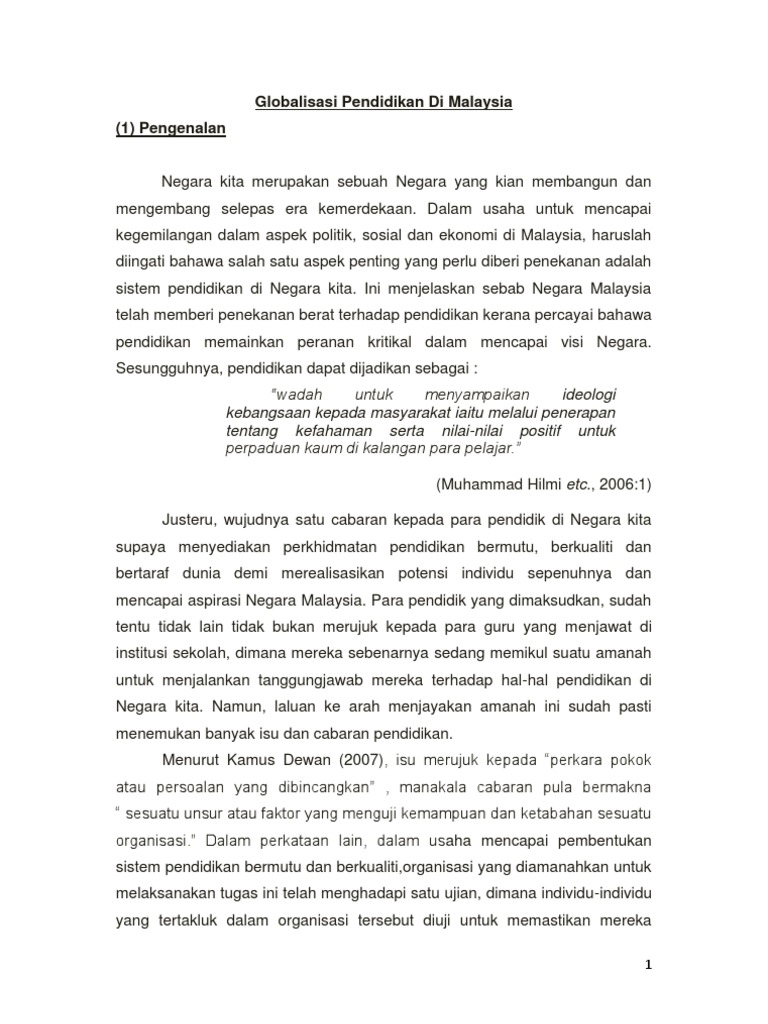 Pembinaan Kemahiran 7M Berdasarkan Globalisasi 60 PENUTUP Kesimpulannya isu dan cabaran globalisasi pendidikan di Malaysia yang melingkari kita sebagai pelajar mahasiswa mahupun yang dalam bidang perguruan telah menjadi masalah yang. Kesungguhan Kerajaan dalam menangani tiga jenis globalisasi ini jelas kelihatan pada berbagai-bagai bentuk wacana di peringkat nasional dan peringkat antarabangsa seperti dialog seminar persidangan dan forum dan juga pada. CABARAN ERA GLOBALISASI KE ATAS WARGA PENDIDIKAN DI MALAYSIA antarabangsa iaitu gelanggang diperkampungan global dengan penuh ketahanan did.